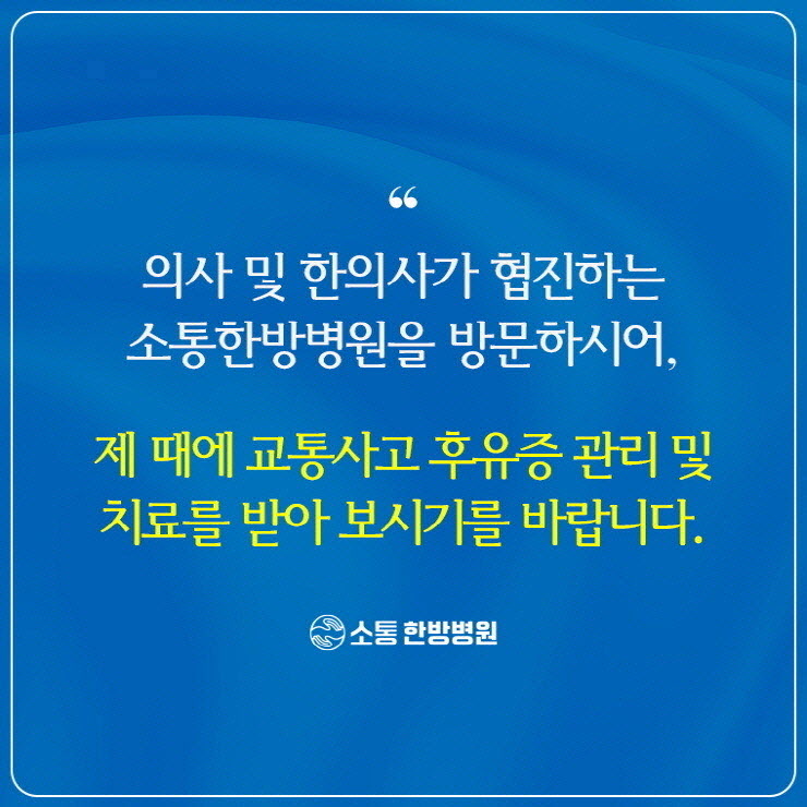 따라서 사고 직후 증상이 경미해 보여도 방심하지 않으면서 정확한 진단과 조기 치료를 받는 것이 중요했습니다.