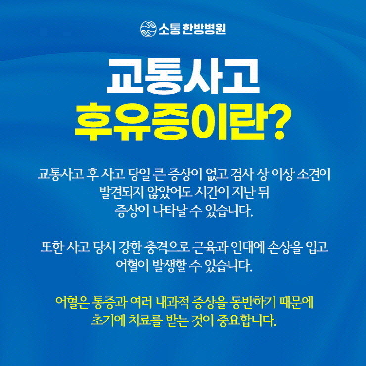 따라서 사고 직후 증상이 경미해 보여도 방심하지 않으면서 정확한 진단과 조기 치료를 받는 것이 중요했습니다.