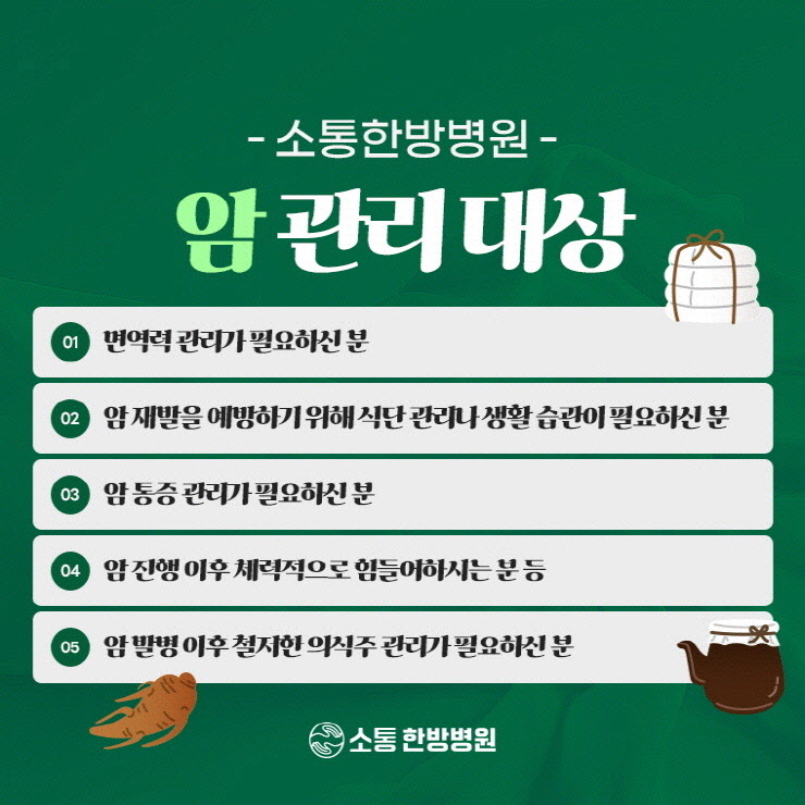 특히나 한의학적 치료는 암 치료의 보조적인 역할을 하면서 환자들의 신체적 회복과 정신적 안정을 도울 수 있다는 점에서 중요한 역할을 하게 되었답니다.
