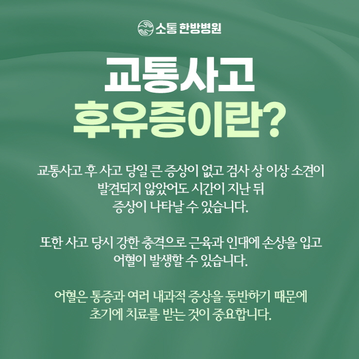 많은 사람들이 사고 직후에는 큰 외상이 없어서 병원에 가지 않거나 치료를 미루는 경우가 많았으나 사고 순간의 충격은 신체의 내부에 미세한 손상을 남길 수 있었습니다.