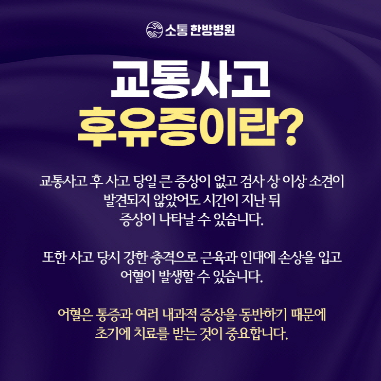 교통사고 후유증은 사고 직후에는 그리 뚜렷하지 않지만 시간이 지나면서 통증이나 불편함으로 나타날 수가 있습니다.